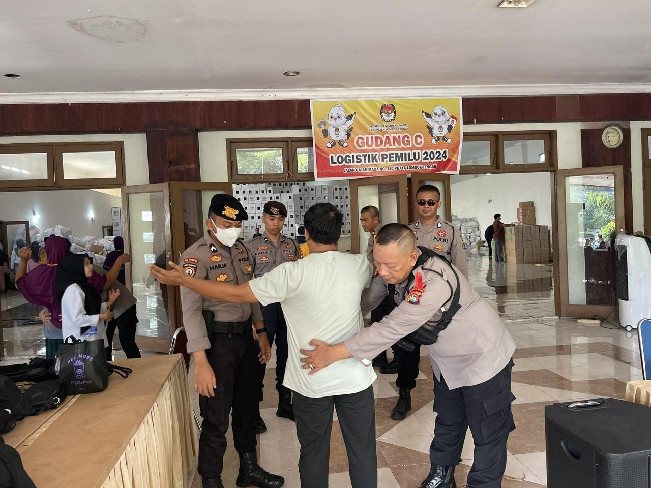 Sebelum memasuki dan keluar gudang logistik, para petugas terlebih dahulu dilakukan pemeriksaan badan oleh petugas dari Kepolisian dan KPU Kabupaten Lombok Tengah guna antisipasi hal hal tidak diinginkan terhadap barang barang bawaan yang tidak diperbolehkan dibawa oleh karyawan pada saat melakukan pelipatan surat suara.