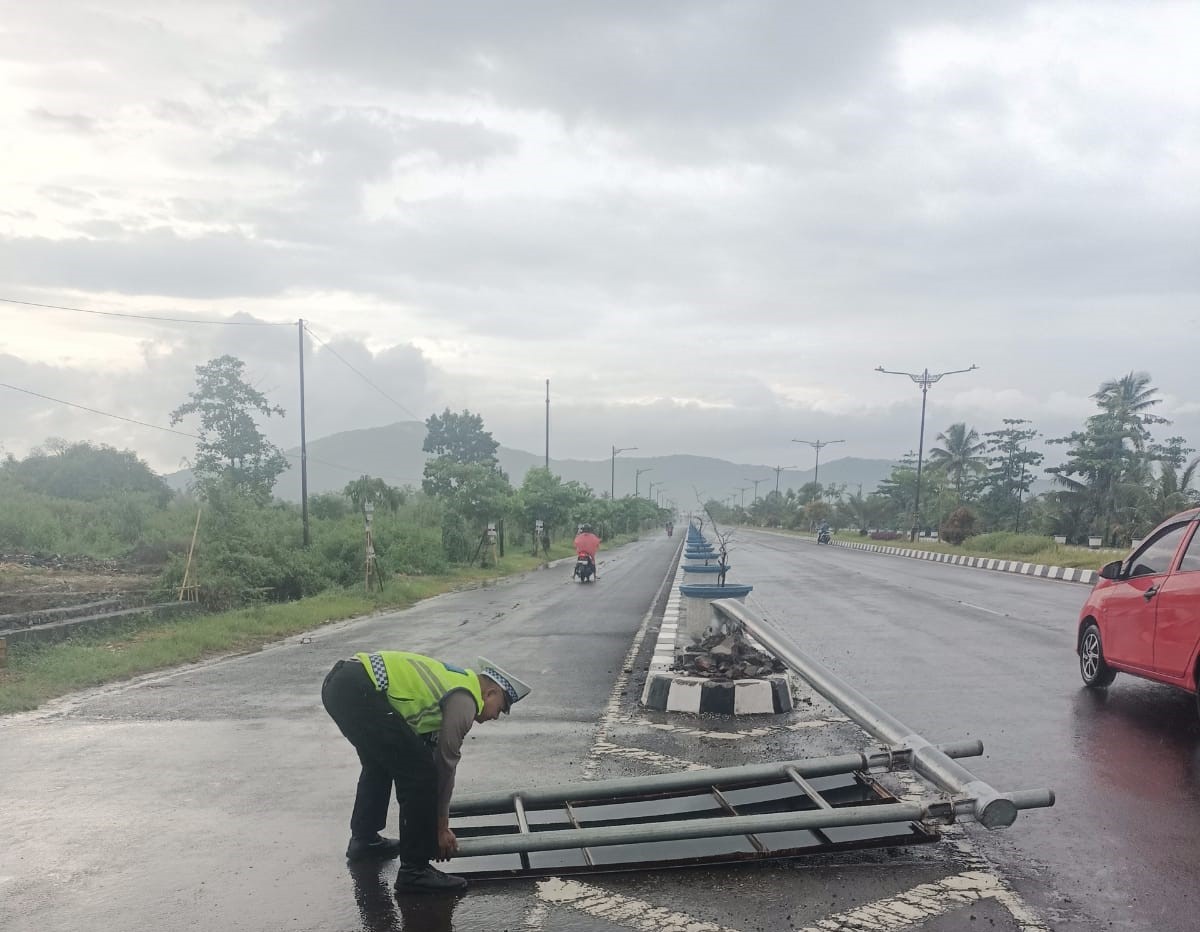 Subsatgas Patroli juga melakukan langkah preventif dengan melakukan evakuasi terhadap plang yang roboh dan ranting pohon yang tumbang menutup jalan, agar tidak membahayakan masyarakat yang melintas.