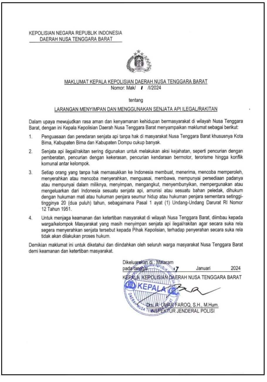 Himbauan Kapolda NTB Irjen Pol Drs Raden Umar Faroq SH.M.Hum itu tertuang dalam maklumatnya tentang larangan menyimpan dan menggunakan senjata api ilegal/rakitan.