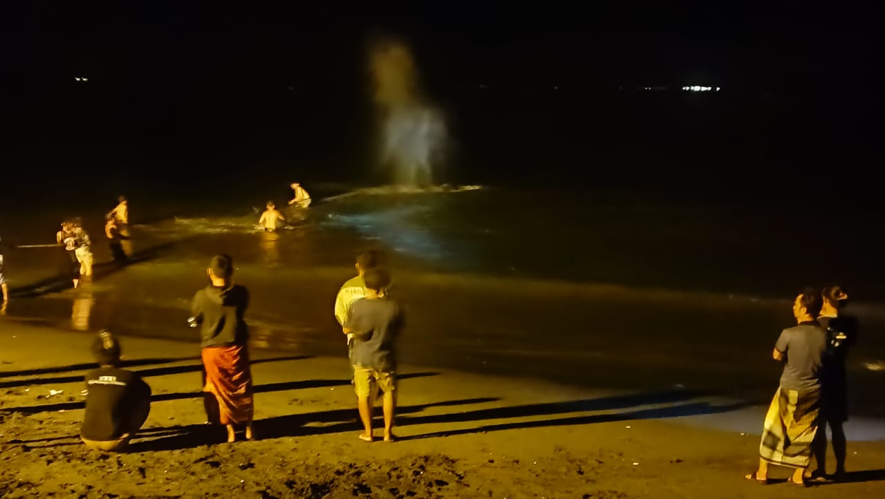 Lombok Timur – Panit Samapta Polsek Peringgabaya, Ipda Thamzil, bersama empat anggota piket jaga lainnya, lakukan pengecekan terhadap ikan paus yang terdampar di Pantai Mbang mbangan, Desa Pringgabaya Utara, Kecamatan Pringgabaya, Kabupaten Lombok Timur pada Rabu, 06 Maret 2024, Pukul 01.00 Wita.