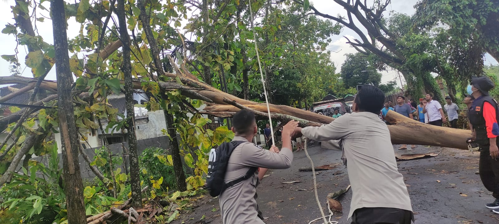 “Akibatnya ada dua pohon yang tumbang, batang pohon yang tumbang ukurannya lumayan besar sehingga menutup total akses jalan dari kedua arah,” katanya.