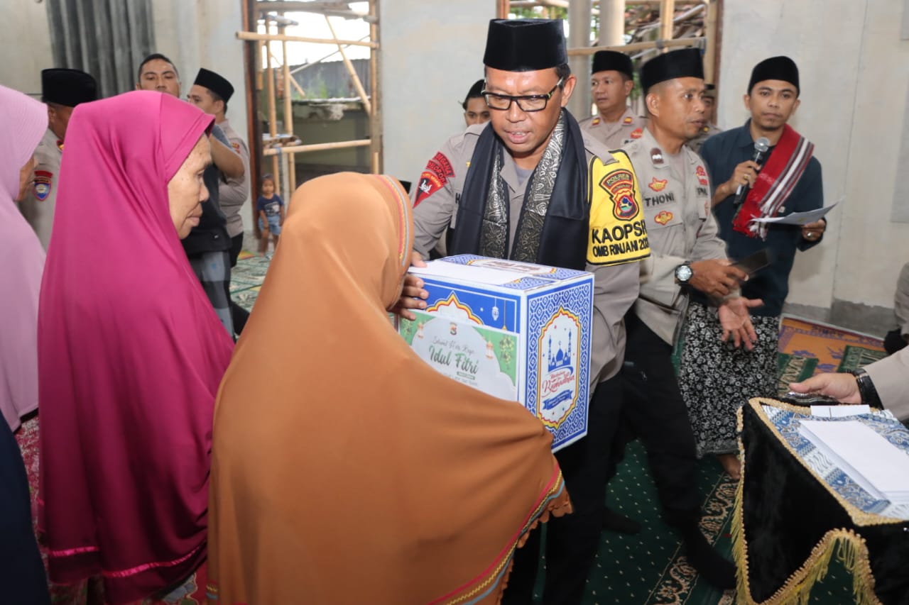 Setelah memberikan sambutan, Kapolres berbagi kasih dengan memberikan santunan kepada anak yatim dan orang tua jompo yang turut hadir dalam kegiatan tersebut. Selain itu, bantuan juga diserahkan langsung kepada pengurus masjid untuk mendukung kelancaran kegiatan keagamaan di Masjid Al Falah Batu Belek.