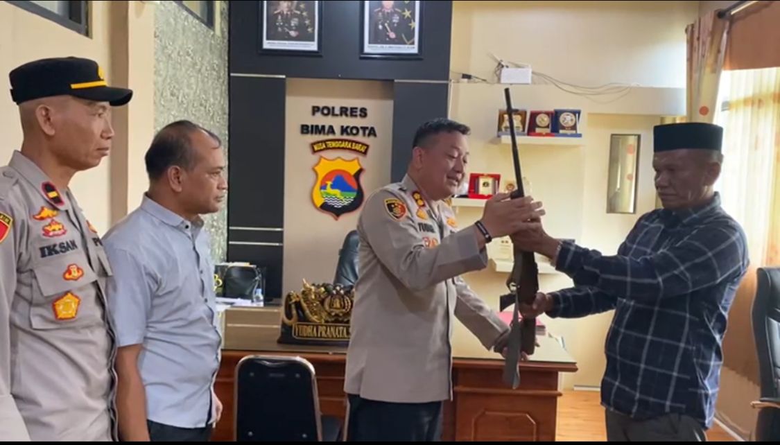 Kota Bima, NTB (16 April 2024) – Kesadaran dan kepatuhan terhadap hukum yang tinggi tercermin ketika seorang tokoh masyarakat dari Kecamatan Wera Kabupaten Bima, menyerahkan sepucuk senjata api rakitan kepada Kapolres Bima Kota, AKBP Yudha Pranata, S.I.K., S.H.