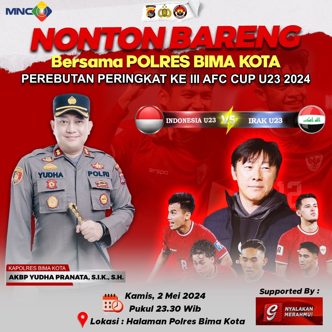 Kota Bima, NTB (03/5) – Semangat meriah menyelimuti kota Bima jelang pertandingan perebutan juara 3 AFC Cup 2024 antara Timnas Indonesia U-23 dan Timnas Irak. Dalam upaya mendukung perjuangan Garuda Muda, Polres Bima Kota kembali menggelar acara Nonton Bareng (Nobar) yang akan berlangsung malam ini, pukul 22.30 Wita, di halaman Mako Polres Bima Kota.
