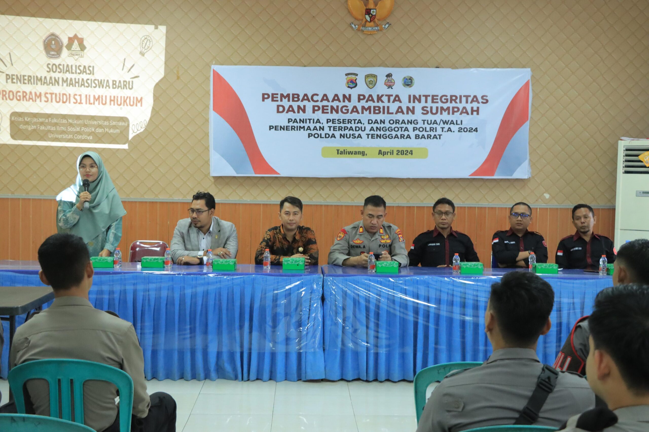 Kapolres Sumbawa Barat AKBP Yasmara Harahap, S. I. K. melalui Kasi Humas IPDA Akhmad Soleh mengatakan, kegiatan sosialisasi Penerimaan Mahasiswa Baru Program Studi Ilmu Hukum, dikoordinir oleh Kabag SDM AKP I Dewa Gede Wija Astawa, S.H. dan Dr. Lahmudin Zuhri, S. H., M. H. selaku Dekan Fakultas Hukum Universitas Samawa.