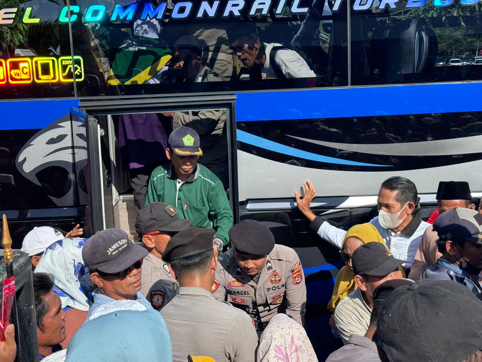 Tampak memimpin pelepasan pemberangkatan Jemaah Calon Haji ini yakni Bupati Dompu, H. Kader Jaelani didampingi Wakil Bupati Dompu, H. Syahrul Parsan, ST., MT., bersama Sekda Gatot Gunawan P. Putra serta Asisten 1 Setda Dompu, H. Burhanuddin.