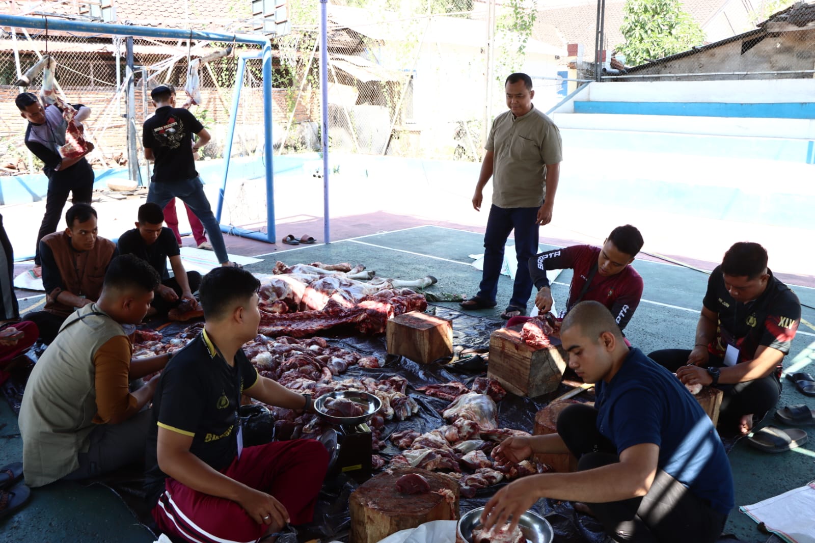 Sumbawa Besar-NTB, Momentum di Hari Raya Idul Adha 1445 Hijriyah, dimanfaatkan Jajaran Polres Sumbawa Polda NTB untuk bersedekah dan berbagi daging hewan qurban. Prosesi penyembelihan hewan qurban ini dilakukan di area parkiran Lapangan Wira Satya Polres Sumbawa, Senin (17/06/24) pagi.