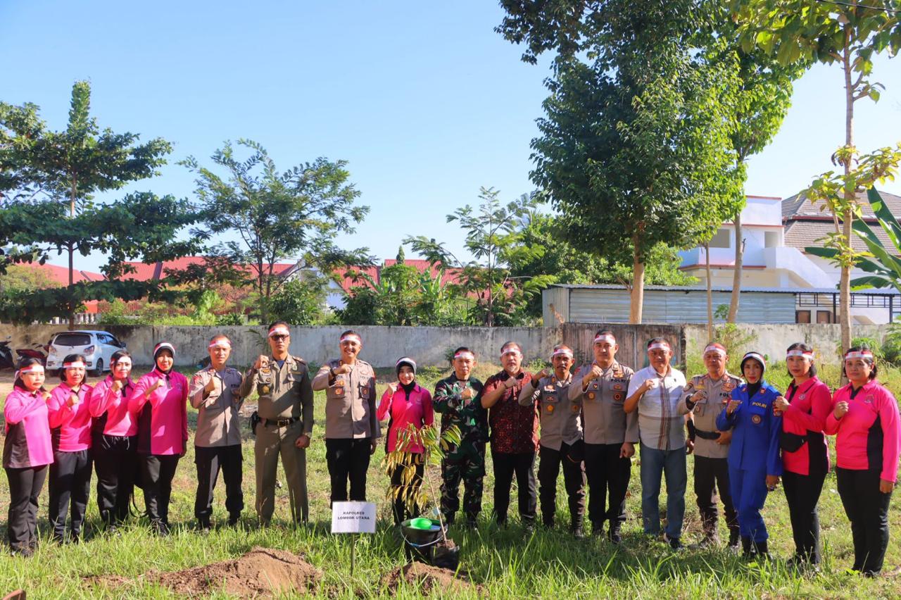 Kapolres Lombok Utara, AKBP Didik Putra Kuncoro, S.I.K, M.Si., memimpin penanaman bibit pohon secara simbolis, diikuti oleh para tamu undangan.