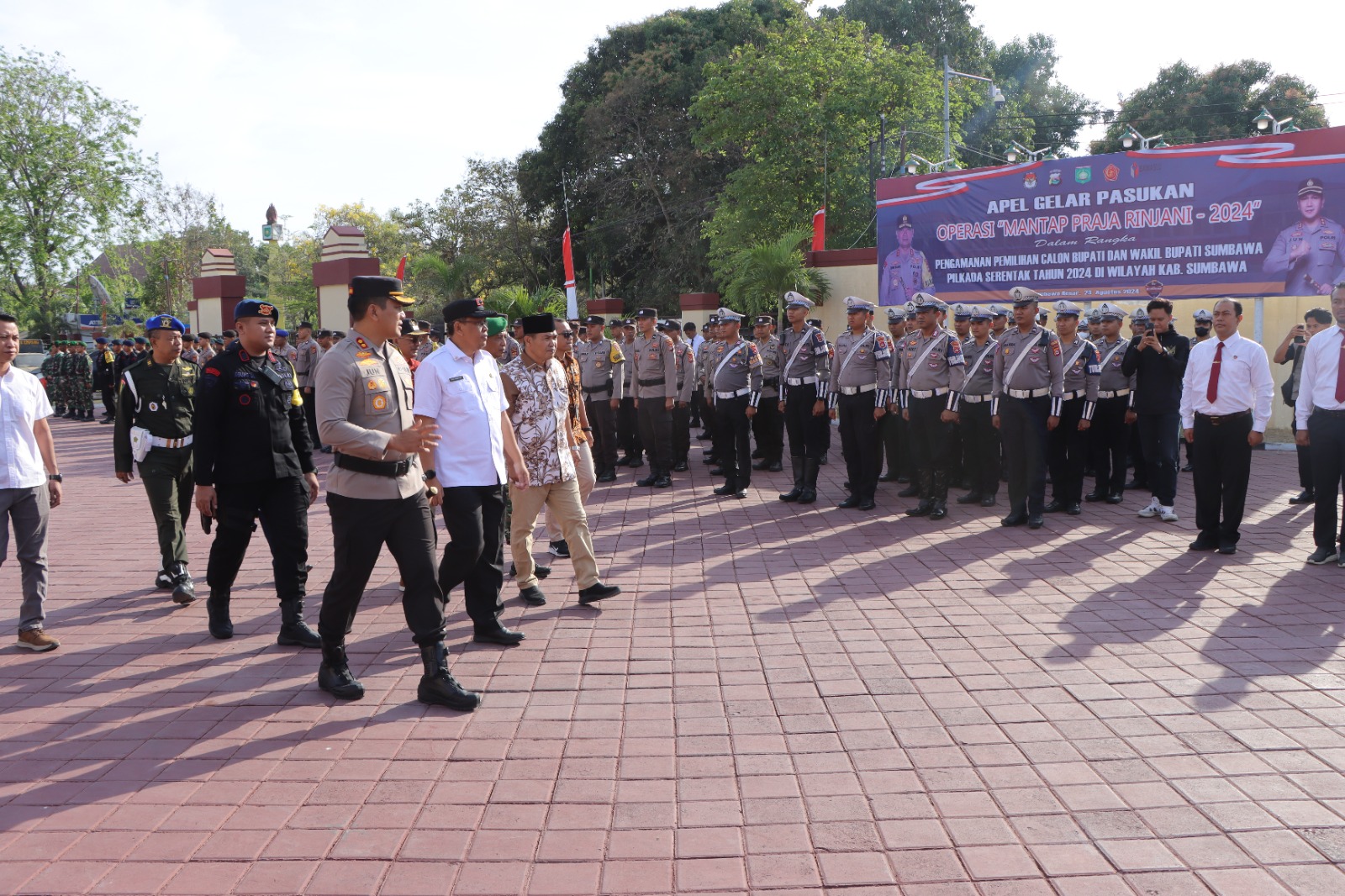 Apel gelar pasukan tersebut turut dihadiri oleh jajaran Forkopimda Kabupaten Sumbawa, KPU, Bawaslu, PJU Polres dan Kapolsek jajaran, serta diikuti oleh peserta apel yang terdiri dari Pasukan TNI-Polri, Pol PP, Dishub, BPBD, Damkar dan juga Senkom.