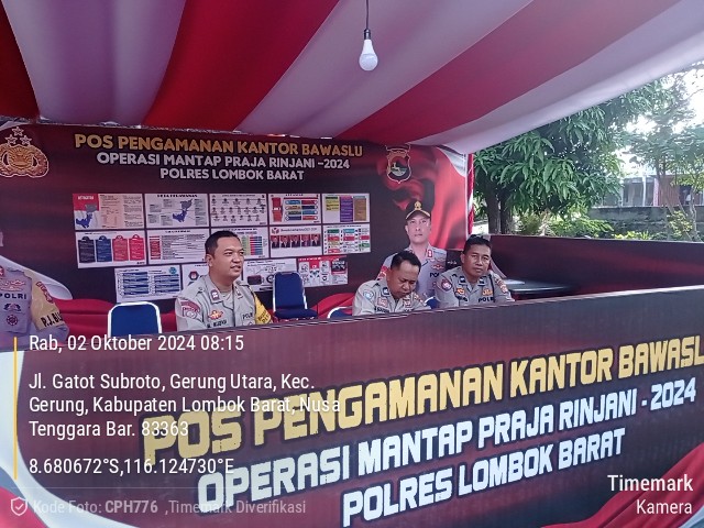 Lombok Barat, 2 Oktober 2024 – Polres Lombok Barat, Polda Nusa Tenggara Barat (NTB) melalui Subsatgas Pos Pengamanan Kantor Bawaslu, terus melakukan pengamanan intensif di Kantor Badan Pengawas Pemilu (Bawaslu) Kabupaten Lombok Barat untuk mendukung kelancaran proses Pemilihan Kepala Daerah (Pilkada) 2024. Kegiatan pengamanan ini berlangsung pada Rabu (2/10), dimulai sejak pukul 08.00 WITA dan dilakukan hingga selesai tanpa kendala berarti.