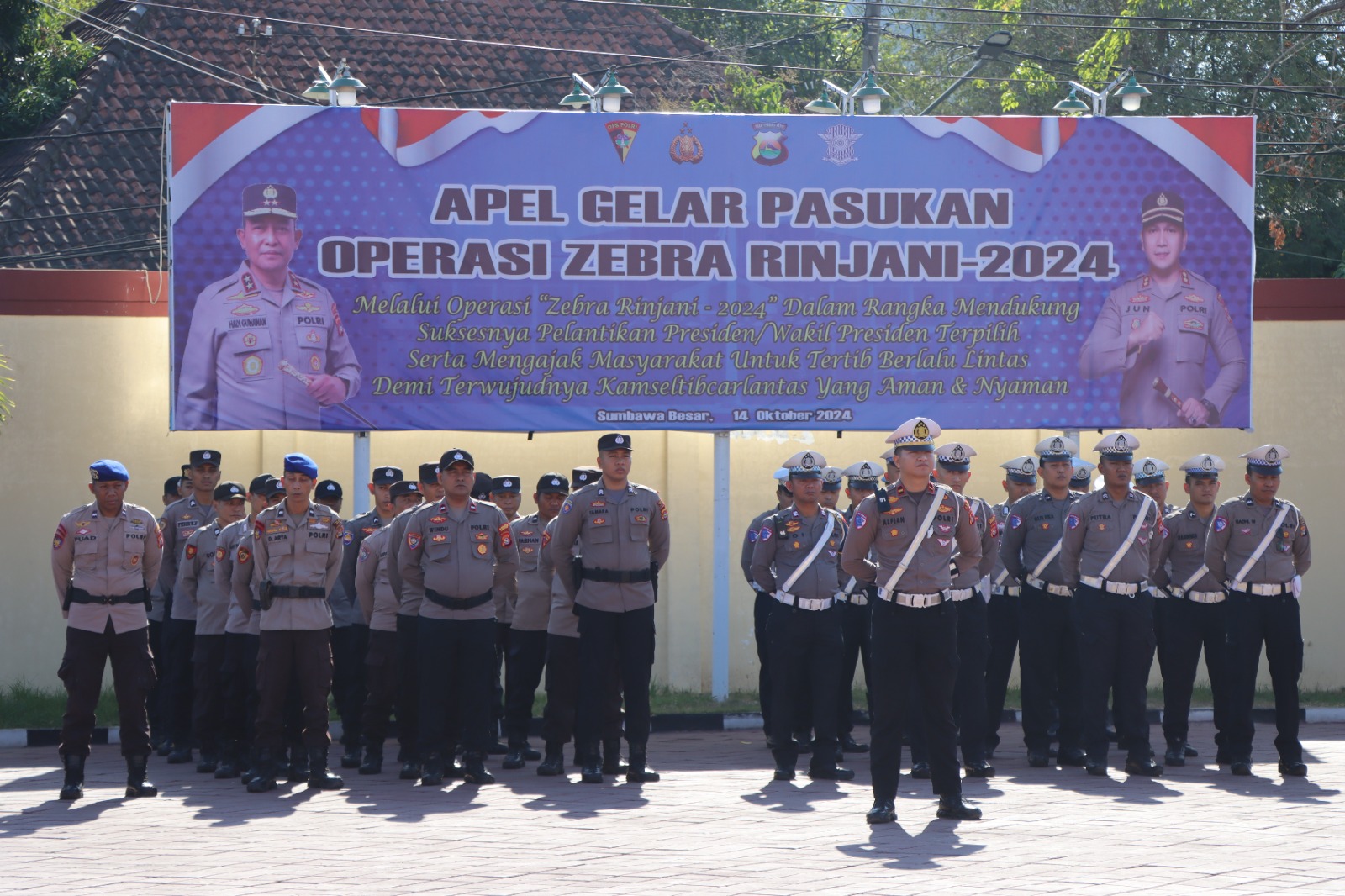 Sumbawa Besar-NTB, Polres Sumbawa Polda NTB menggelar apel gelar pasukan menandai dimulainya pelaksanaan Operasi Zebra Rinjani 2024 di Lapangan Apel Wiicaksana Laghawa Mapolres Sumbawa, Senin (14/10/24) pagi.