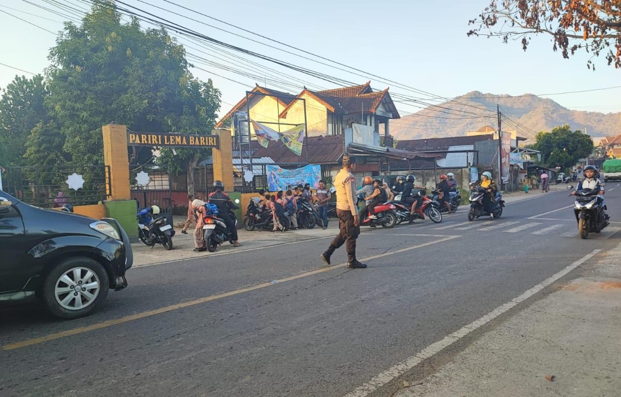 Sumbawa Barat – Polsek Taliwang memberikan pelayanan keamanan lalu lintas bagi siswa, guru, dan orang tua/wali menggelar strong point dengan melakukan penjagaan di jalan raya di depan SDN 2 Taliwang.