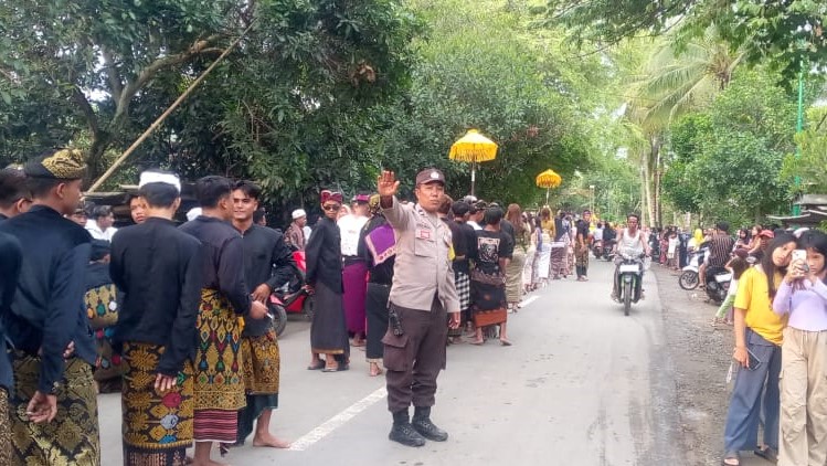 Bhabinkamtibmas Desa Sekotong Barat dan Sekotong Timur bersama Babinsa Desa Sekotong Timur bertugas di titik-titik strategis di sepanjang jalur prosesi.