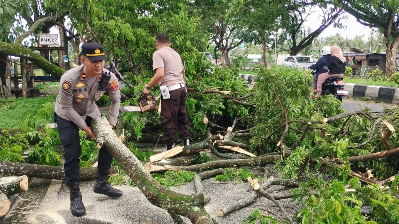 Pohon Trembesi yang tumbang memenuhi badan jalan menyebabkan arus lalu lintas terganggu. Tim gabungan yang terdiri dari Polsek Kuripan, BPBD Kabupaten Lombok Barat, Camat Kuripan, dan petugas patroli lalu lintas Polres Lombok Barat segera mengambil langkah untuk memulihkan situasi.