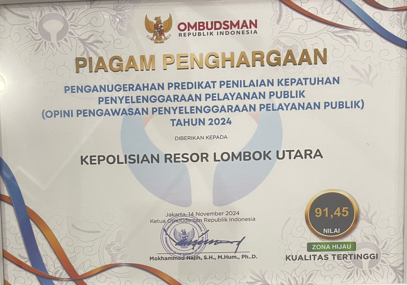Penghargaan ini diberikan sebagai komitmen dan upaya Polres Lombok Utara dalam meningkatkan kualitas pelayanan publik ( public service) di wilayahnya, Dengan nilai 91,45 masuk dalam Zona Hijau Kualitas tertinggi.