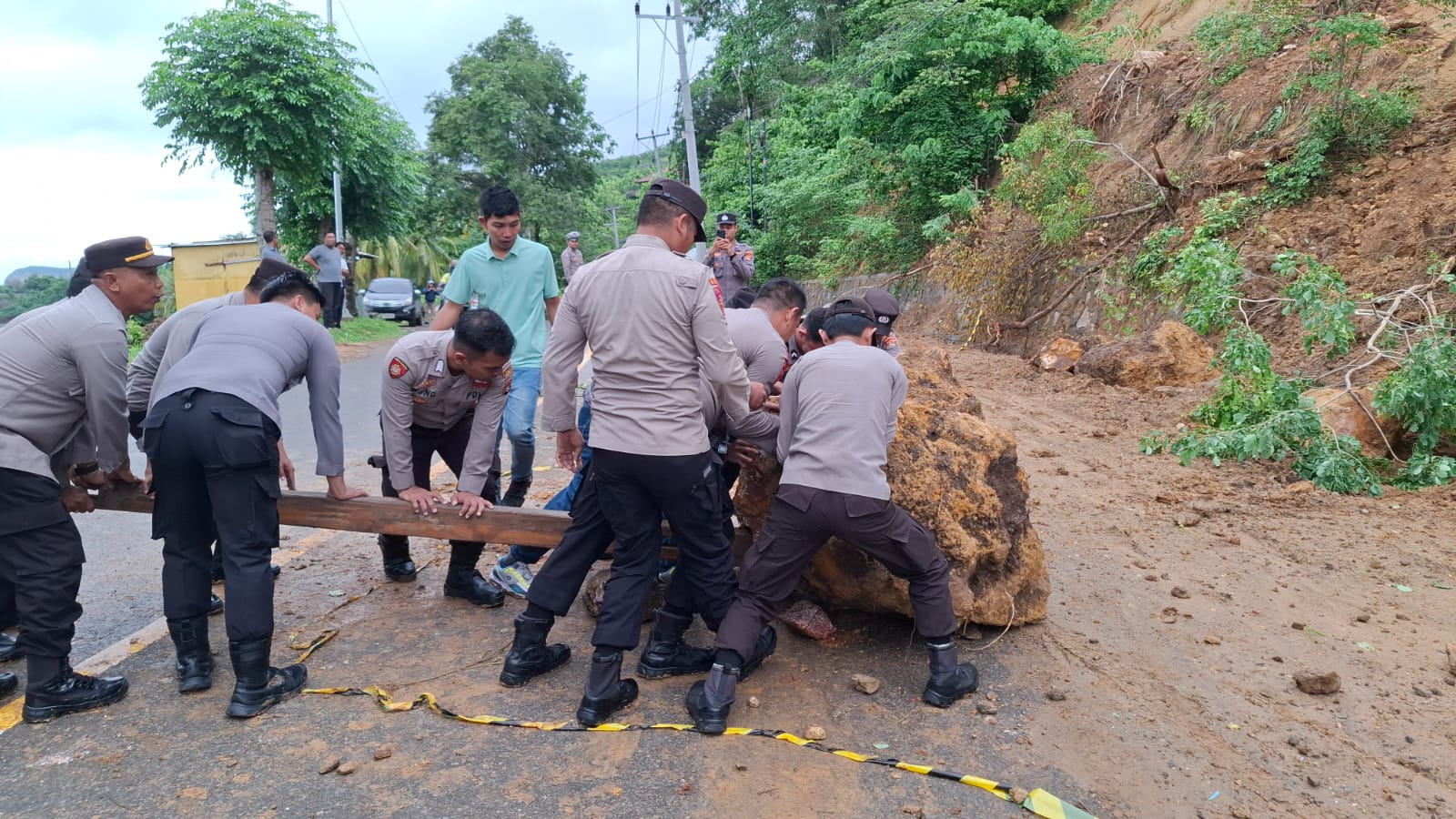 Personel Polres Sumbawa Barat Evakuasi Bongkahan Batu Raksasa di Jalan Raya