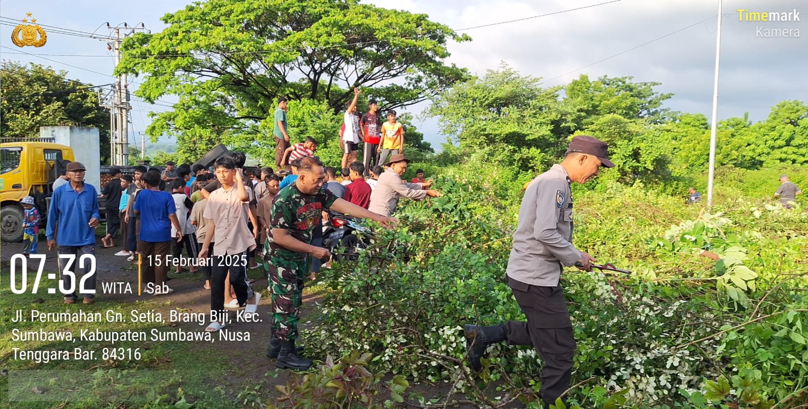 Sumbawa Besar–NTB, TNI-Polri, dan Pemerintah Kelurahan Brangbiji bersama masyarakat menggelar kegiatan gotong royong untuk membersihkan sampah di sekitar Tempat Pemakaman Umum (TPU) Gunung Setia, Sabtu pagi tanggal 15 Februari 2025.