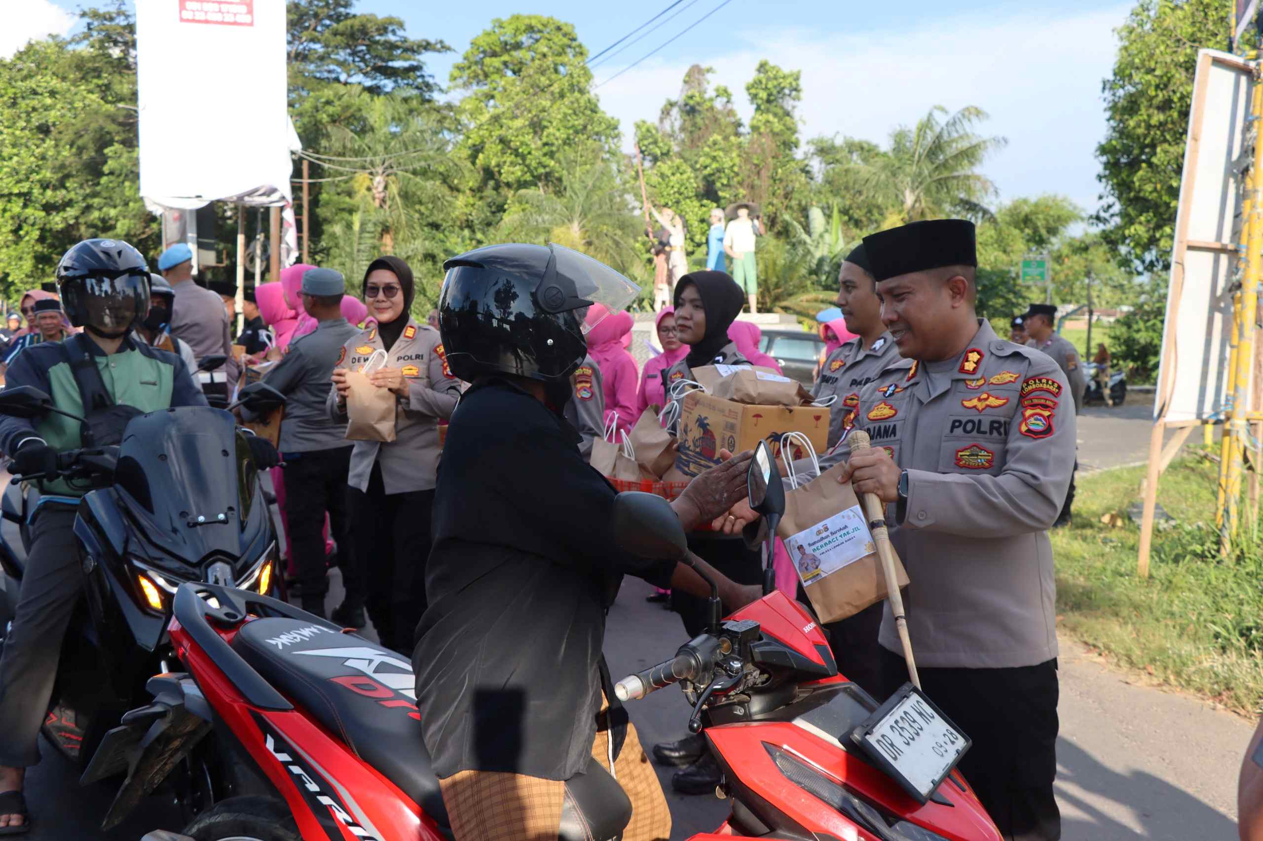 Kegiatan pembagian takjil dimulai di Simpang 5 Koperasi, Kecamatan Gerung. Sejak pukul 16.30 Wita, personel Polres Lombok Barat telah bersiap untuk menyambut masyarakat dan pengguna jalan yang melintas. Kapolres AKBP I Komang Sarjana beserta PJU Polres Lombok Barat tiba di lokasi dan langsung terjun membagikan takjil.