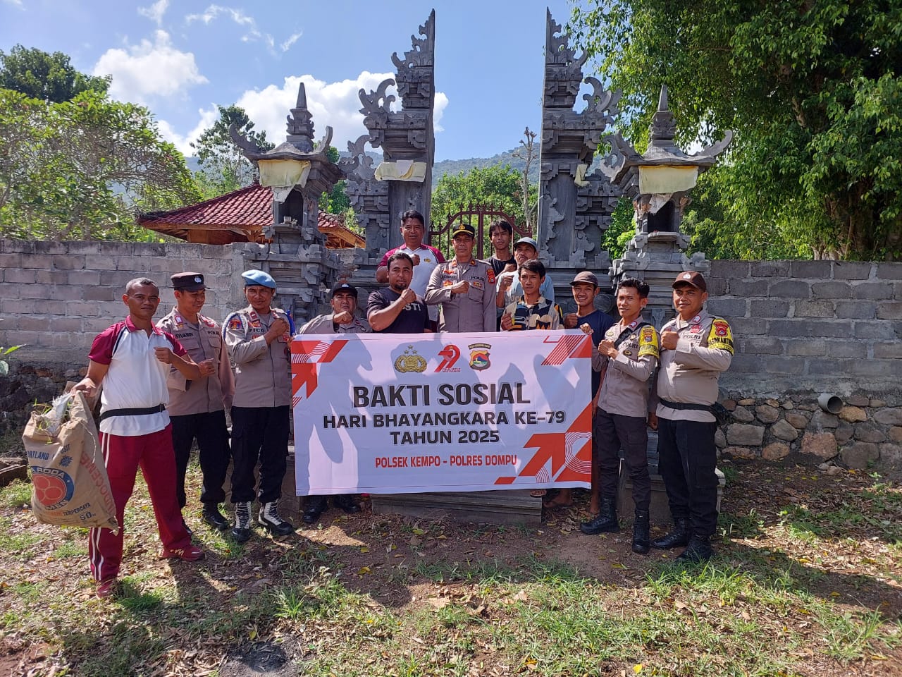 Dalam rangka memperingati Hari Bhayangkara ke-79, Kepolisian Sektor (Polsek) Kempo melaksanakan kegiatan bakti sosial yang berlokasi di Pura Banjar Karang Dewata, Dusun Ruhu Ruma, Desa Songgajah, Kecamatan Kempo, Kabupaten Dompu, Sabtu (14/6/2025).