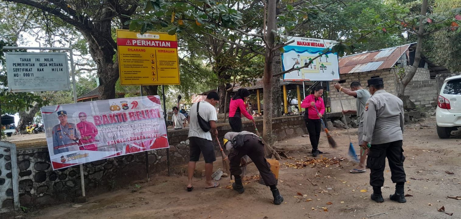 Lombok Utara – Anggota Polsek Tanjung bersama Bhayangkarinya melaksanakan Bakti Religi dalam rangka menyambut Hari Bhayangkara ke-79 di beberapa titik ya g ada di Kecamatan Tanjung, KLU, Selasa, 17/6/2025.