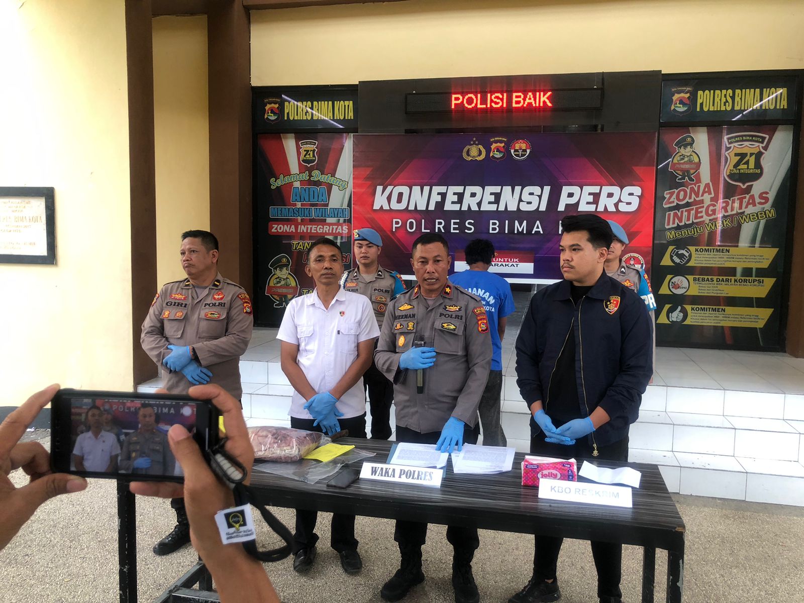 Informasi resmi ini disampaikan oleh Wakapolres Bima Kota Kompol Herman, S.H., saat menggelar konferensi pers pada Rabu sore (18/6) sekitar pukul 17.30 WITA di Mako Polres Bima Kota. Wakapolres didampingi oleh KBO Reskrim I Wayan Mariana, Kasiwas Iptu Putu Surwarjana Giri, Kanit Pidum Ipda Henry Jonathan Hutaurut, serta sejumlah pejabat utama Polres Bima Kota.