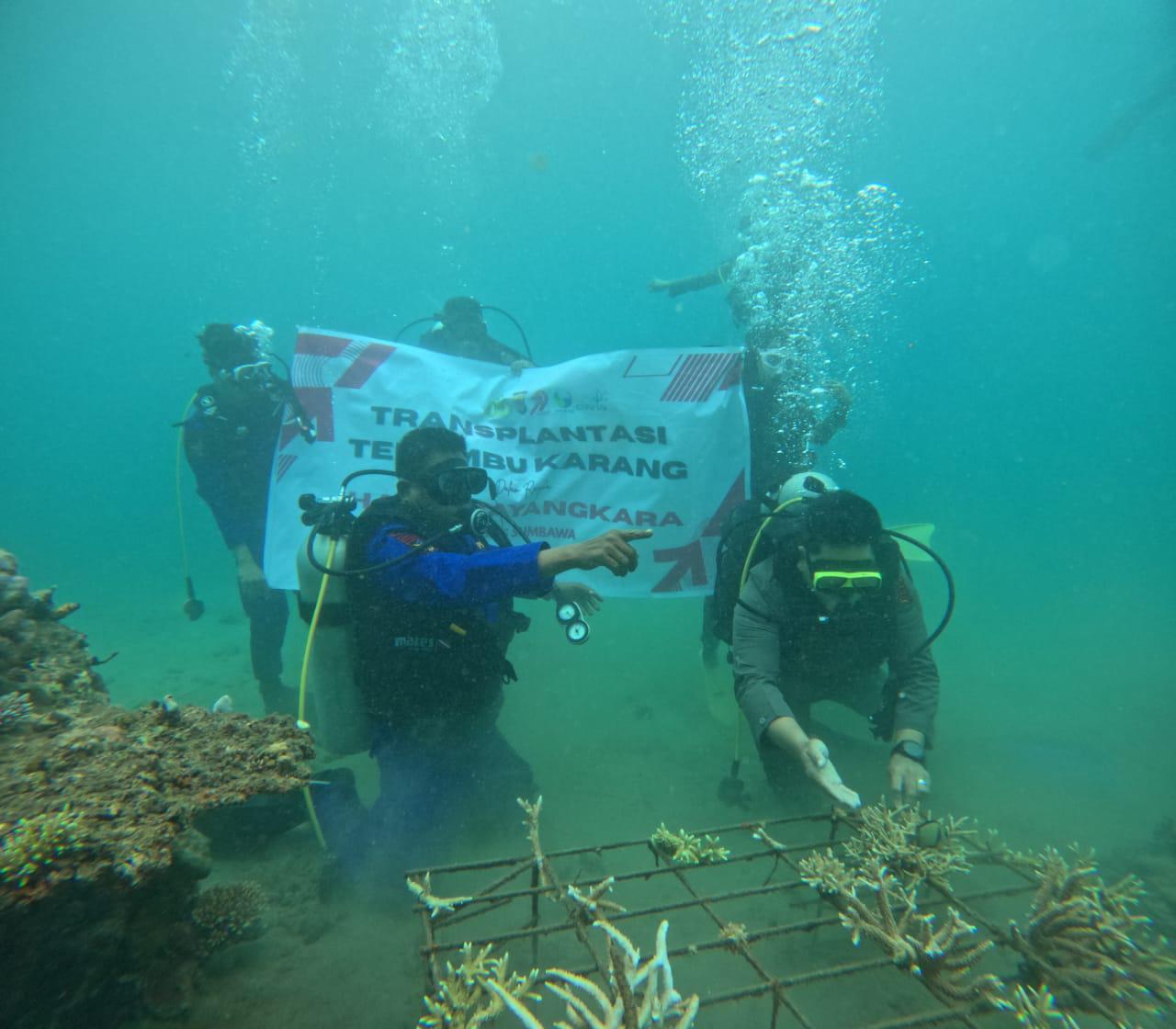 Sumbawa Besar, NTB — Kapolres Sumbawa, didampingi oleh tim selam Satuan Polisi Air dan Udara (Sat Polairud) Sumbawa, sukses melaksanakan kegiatan transplantasi terumbu karang di Pantai Kencana Labuan Sumbawa pada Kamis, 26 Juni 2025. Kegiatan yang dimulai pukul 09.00 WITA hingga selesai ini diselenggarakan dalam rangka memperingati Hari Bhayangkara ke-79.
