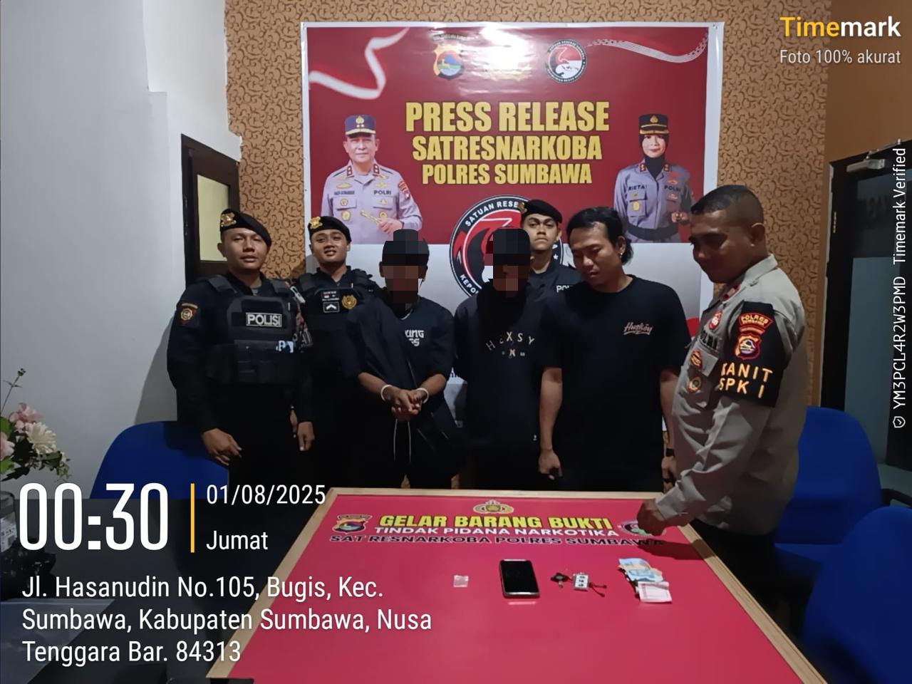 Sumbawa Besar, NTB — Pada hari Jum’at (01/08/2025) sekita pukul 00.20 Wita, Tim Patroli Satuan Samapta Polres Sumbawa berhasil mengamankan dua orang remaja laki-laki mencurigakan berinisial S (23) dan J (18) yang menggunakan knalpot racing di pinggir jalan raya bukit tinggi tepatnya di Jalan Ki hajar Dewantara Kel. Pekat Kec.Sumbawa Kab.Sumbawa. Salah seorang remaja tersebut mengantongi sebuah poket narkotika yang diduga sabu.