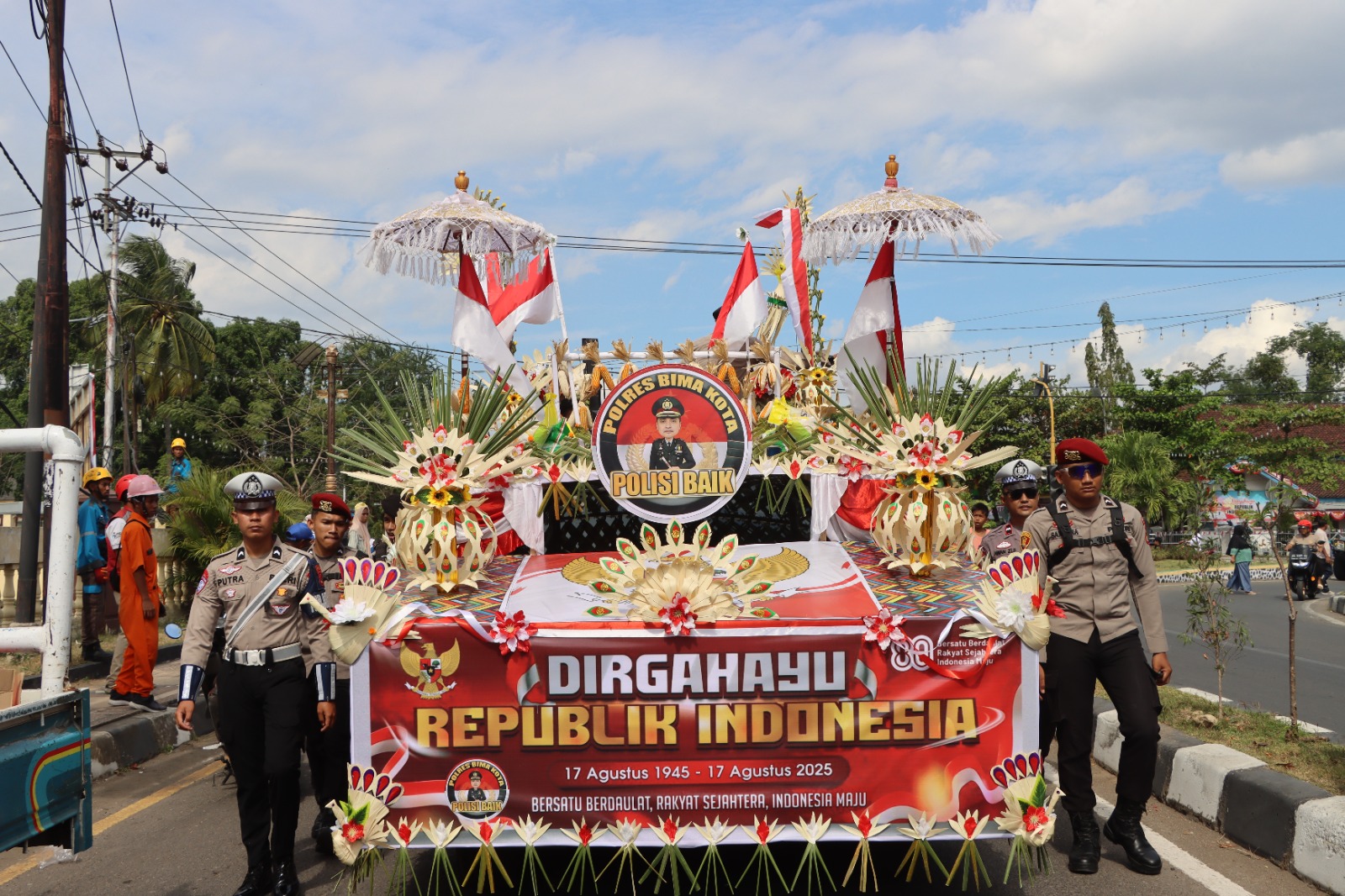 Kapolres Bima Kota AKBP Didik Putra Kuncoro, S.I.K., M.Si., hadir langsung dan memimpin partisipasi Polres Bima Kota dengan menampilkan kendaraan hias bertuliskan slogan “Polisi Baik Polres Bima Kota”. Slogan tersebut merupakan akronim dari Bermartabat, Amanah, Intelek, dan Konsisten, sebagai wujud komitmen Polres Bima Kota dalam membangun citra positif dan mempererat hubungan dengan masyarakat.