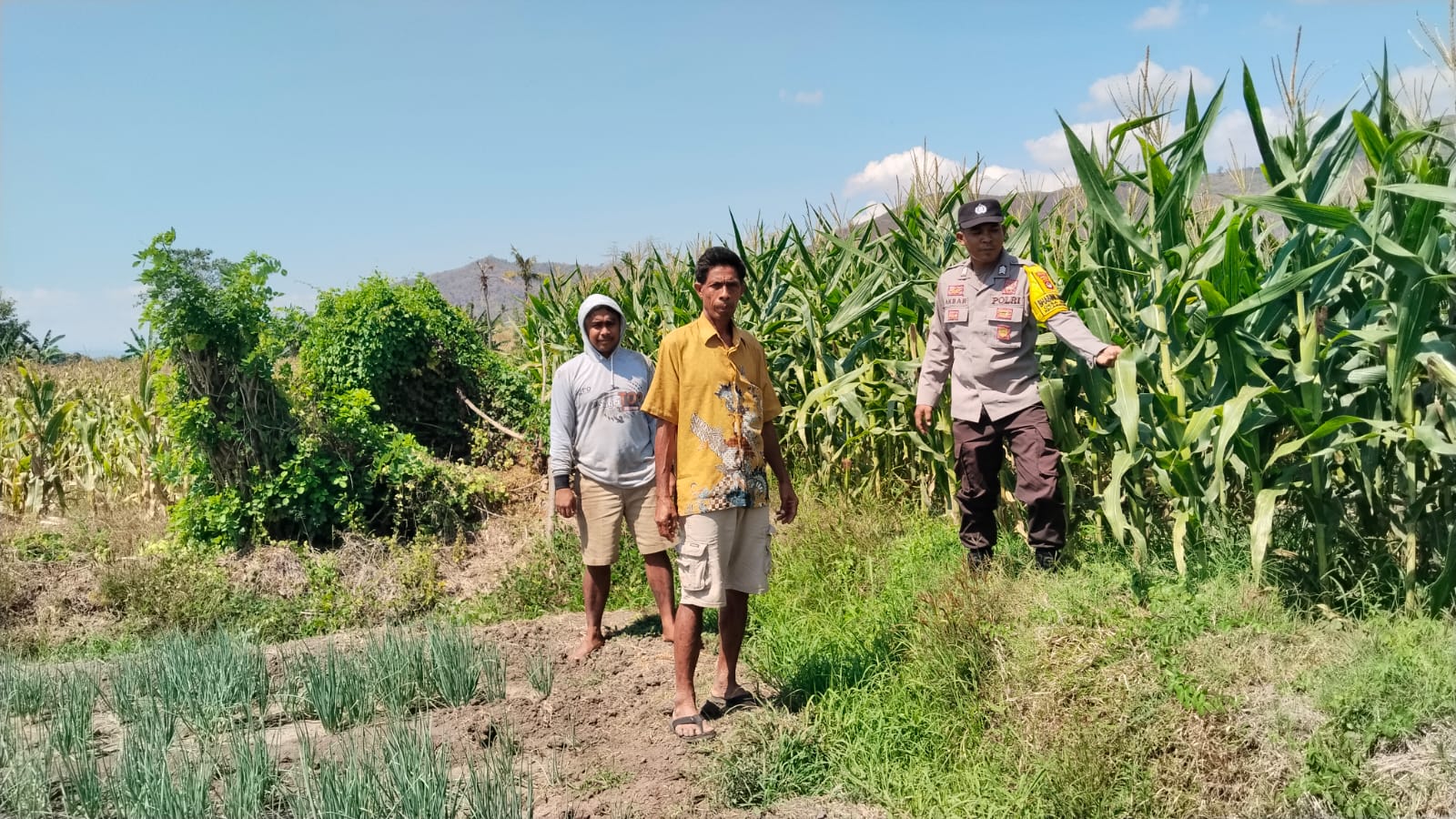 Selasa, 16 September 2025, Bhabinkamtibmas (BKTM) Desa Mumbu, Brigadir Akbar, melaksanakan kegiatan pemantauan perkembangan tanaman jagung milik warga binaan di Dusun Madamina, Desa Mumbu, Kecamatan Woja, Kabupaten Dompu.