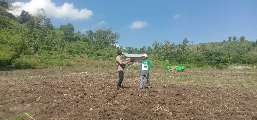 Bhabinkamtibmas Desa Rababaka, AIPTU Purwanto, memantau lahan jagung warga di Dusun Mantua yang dikelola Syahbudin. Lahan tersebut sedang disiapkan untuk penanaman jagung hibrida varietas HULK sebagai bagian dari Program Ketahanan Pangan Nasional Menuju Indonesia Emas 2045.