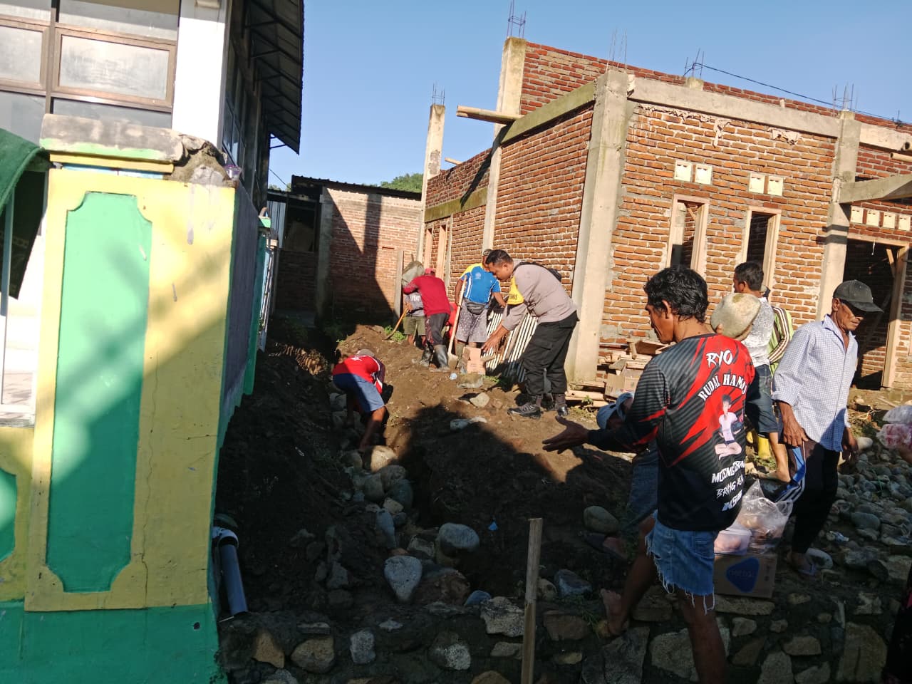 Kegiatan ini juga diikuti oleh masyarakat setempat dengan penuh kebersamaan. Mereka saling bahu membahu mengangkat material, menata batu pondasi, dan melakukan penggalian, sehingga proses pembangunan masjid dapat berjalan dengan lancar.