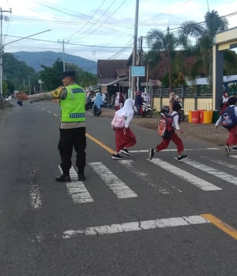 Sumbawa Barat – Personel Polsek Jereweh melaksanakan kegiatan pengaturan lalu lintas pada jam masuk sekolah di depan SDN 1 Goa, Kecamatan Jereweh, Kabupaten Sumbawa Barat, sebagai bentuk pelayanan prima kepada masyarakat, khususnya para pelajar dan orang tua siswa, pada jam rawan kepadatan kendaraan, pagi hari. Senin,(01/12/2025)