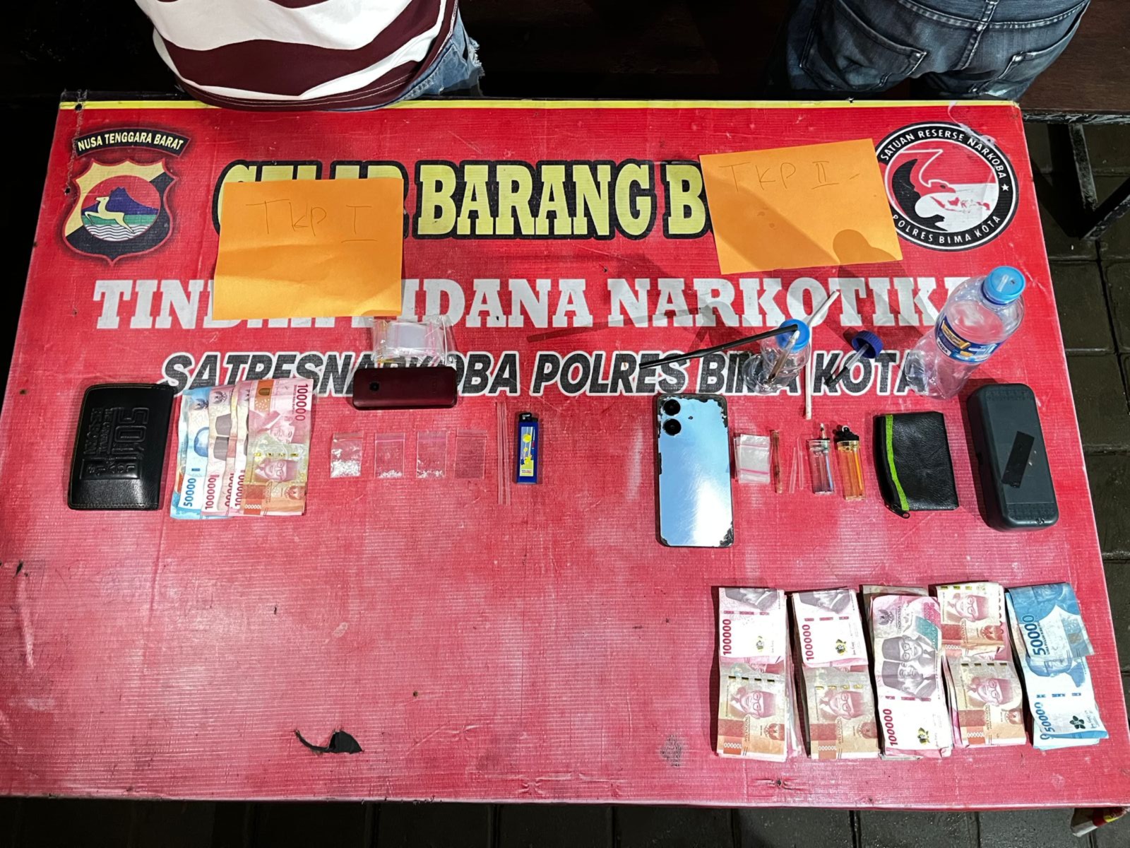 Di lokasi kedua, petugas berhasil mengamankan terduga SM (51), warga Kelurahan Sarae, Kecamatan Rasanae Barat, Kota Bima. Dari hasil penggeledahan, tim menemukan barang bukti berupa 10 (sepuluh) bungkus plastik klip kosong, 2 (dua) alat hisap/bong, 1 (satu) dompet warna hitam, 1 (satu) kaca, 2 (dua) korek api, 2 (dua) sendok pipet, 1 (satu) unit handphone Realme warna biru muda, serta uang tunai sebesar Rp7.900.000,- (tujuh juta sembilan ratus ribu rupiah).