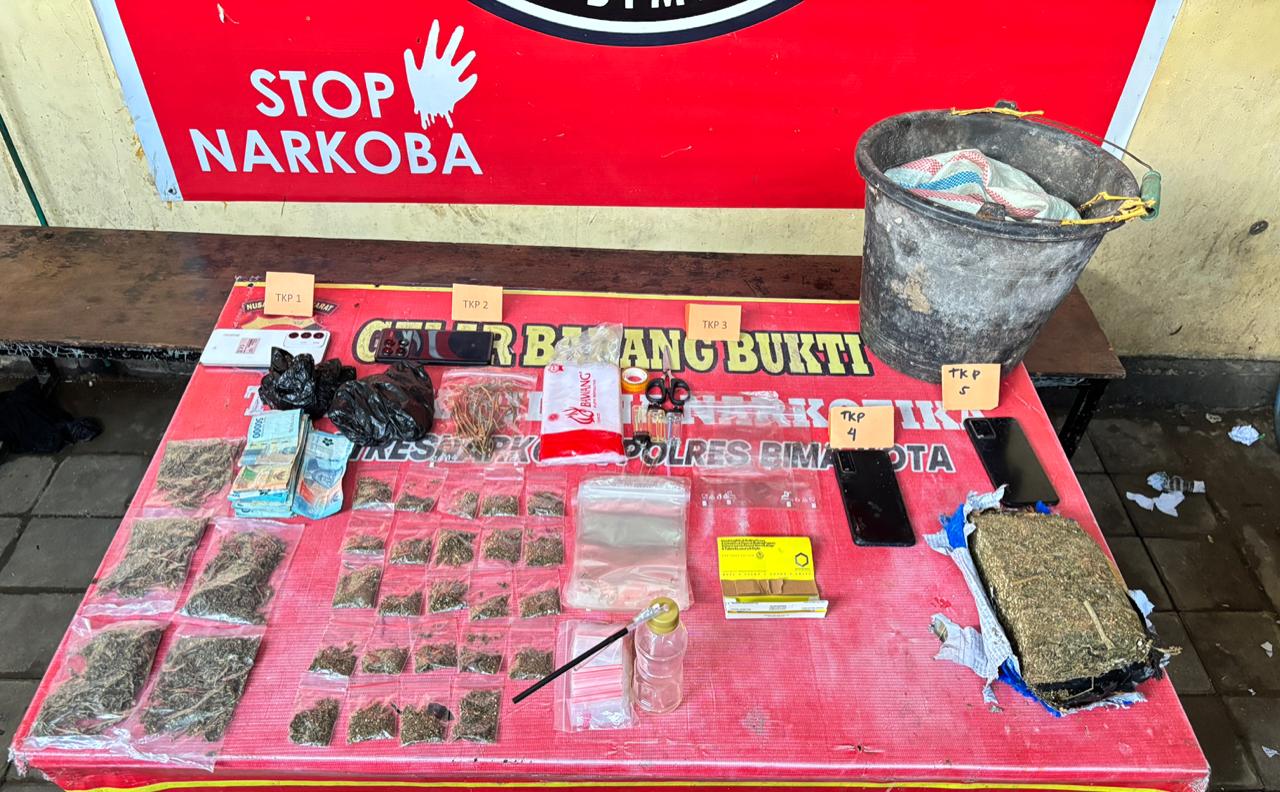 Kota Bima, NTB (2 Maret 2026) – Satuan Reserse Narkoba (Sat Resnarkoba) Polres Bima Kota berhasil mengungkap kasus peredaran narkotika jenis ganja dengan total berat bruto 526,42 gram di wilayah hukumnya, Senin (2/3/2026). Dalam pengungkapan tersebut, lima orang terduga pengedar berhasil diamankan di lima tempat kejadian perkara (TKP) berbeda.